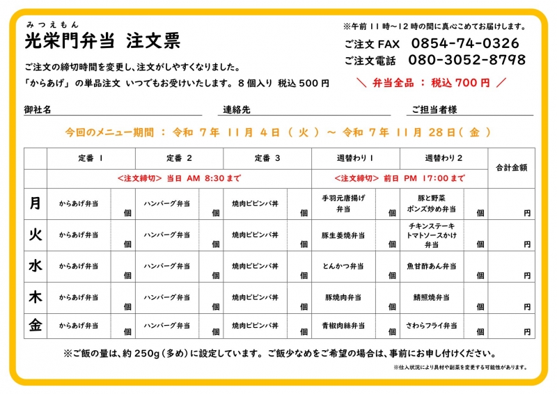 雲南市吉田町の大嶋鮮魚店(光栄門)です。11/4(火)~11/28(金) のお昼の配達弁当をご案内いたします。